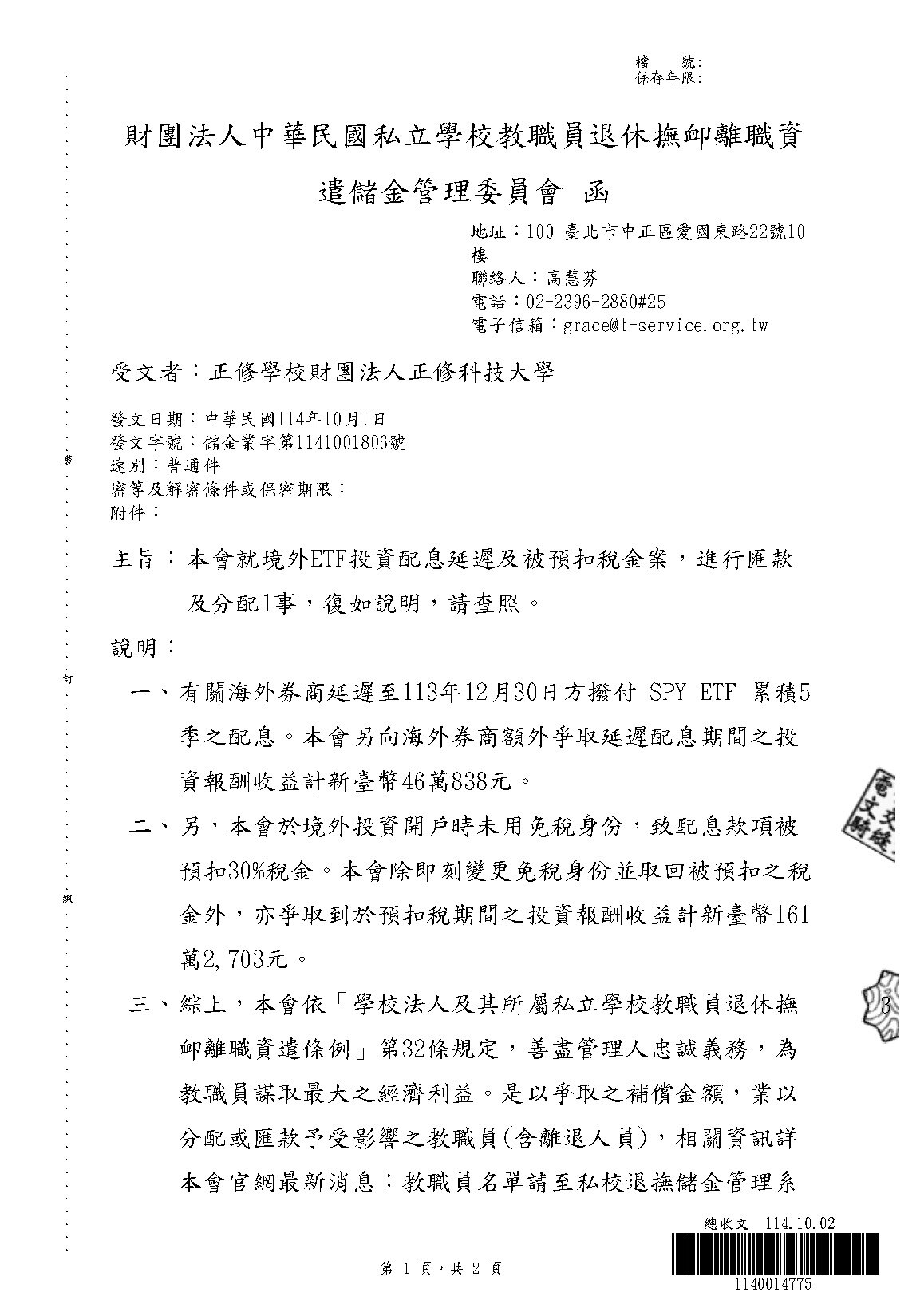 [轉知]財團法人中華民國私立學校教職員退休撫卹離職資遣儲金管理委員會就境外ETF投資配息延遲及被預扣稅金案,進行匯款及分配乙事,詳如說明。